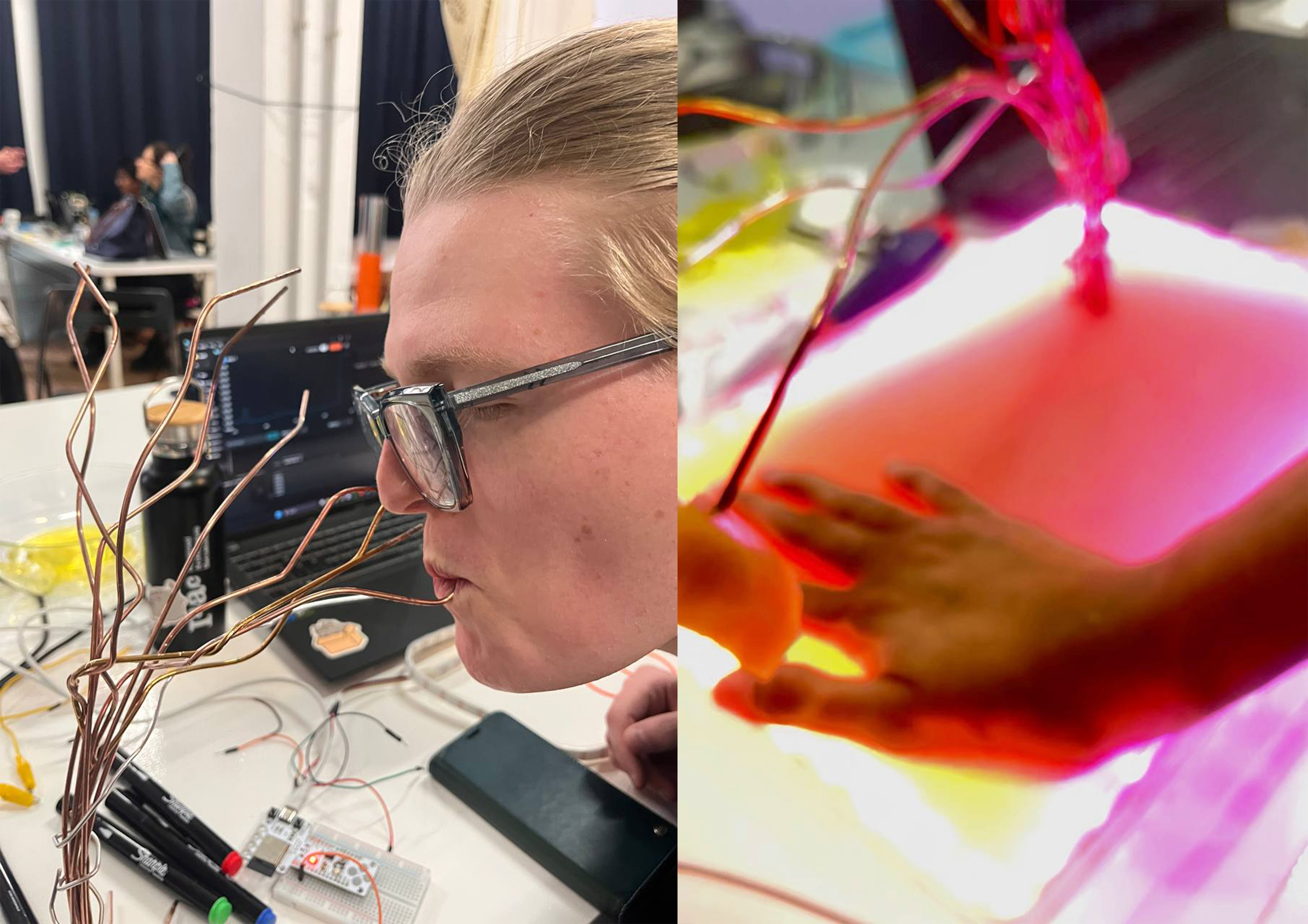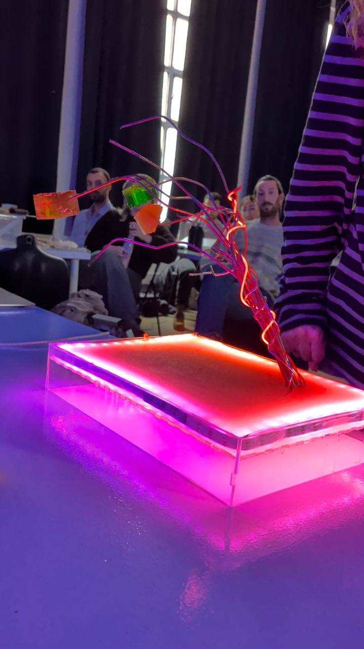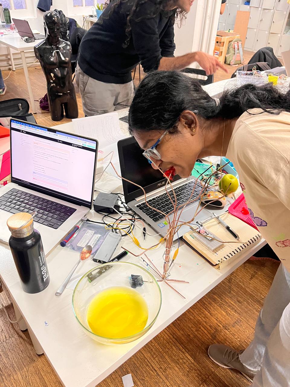 During the prototyping phase, the discovery of flexible copper conductive wires allowed the team to construct a branching structure resembling a tree. This form provided both an aesthetic and functional solution: each branch could act as an individual sensing node connected to edible materials.