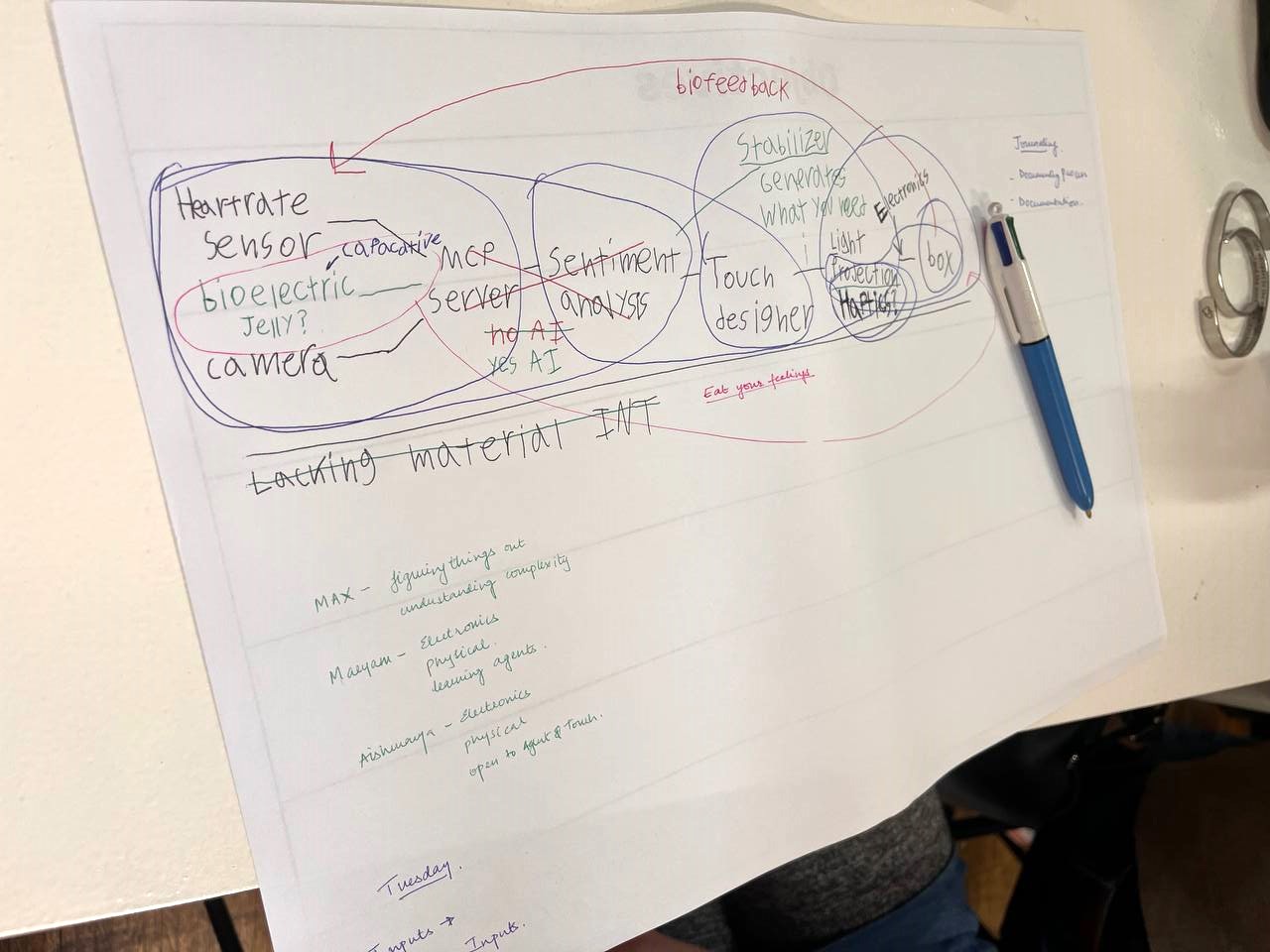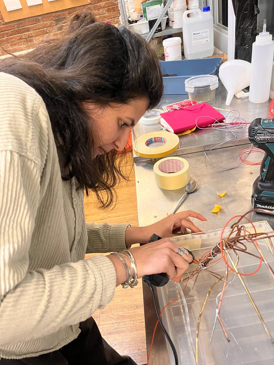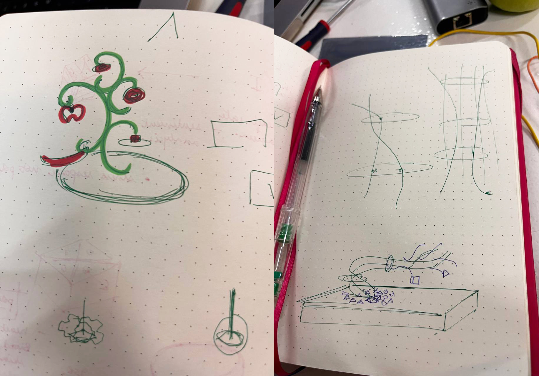 During the prototyping phase, the discovery of flexible copper conductive wires allowed the team to construct a branching structure resembling a tree. This form provided both an aesthetic and functional solution: each branch could act as an individual sensing node connected to edible materials.