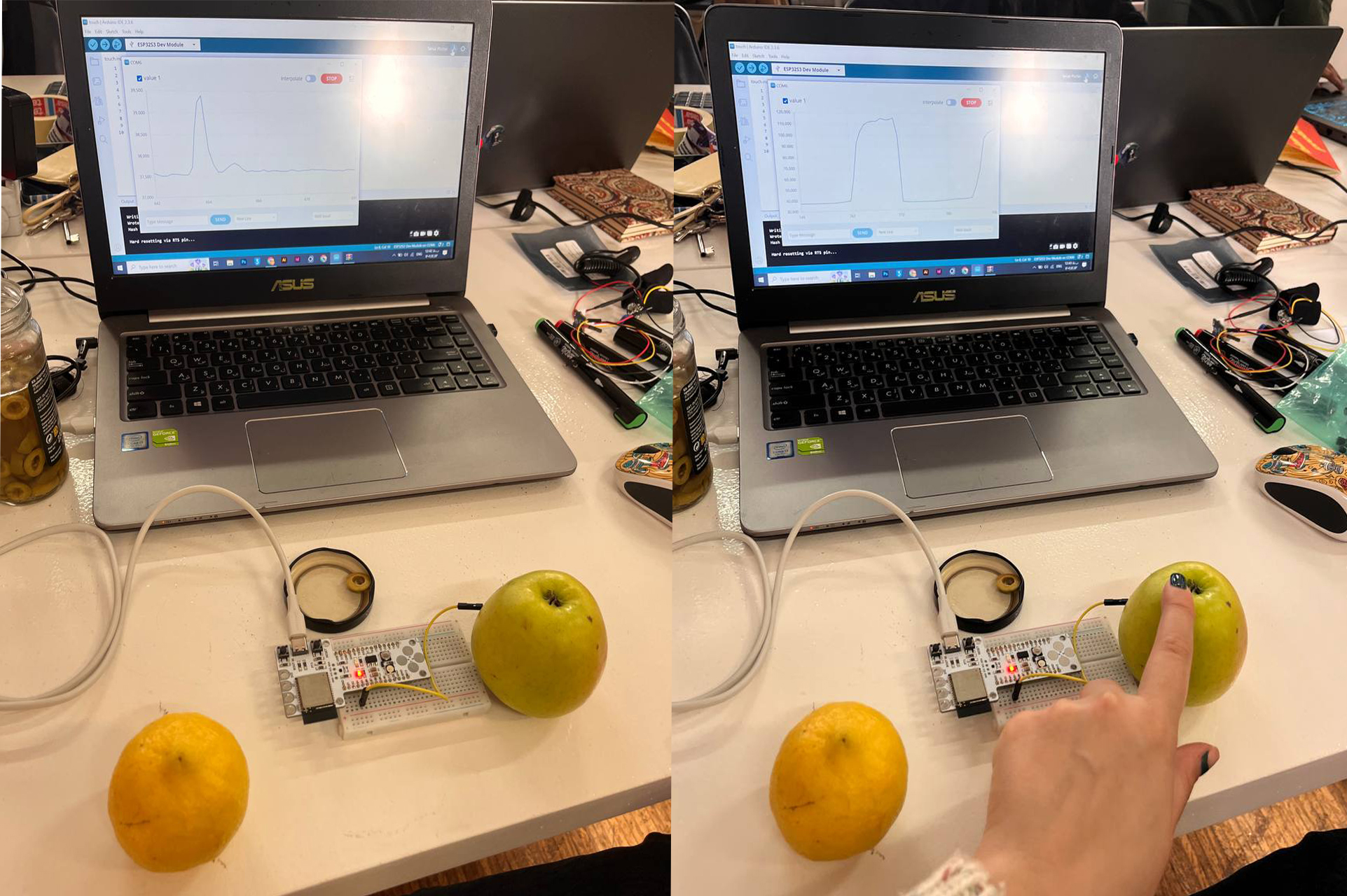 This challenge led to experimentation with fruits and gelatin-based foods such as grapes and jelly. These materials provided stable physical forms while maintaining strong capacitive responses.