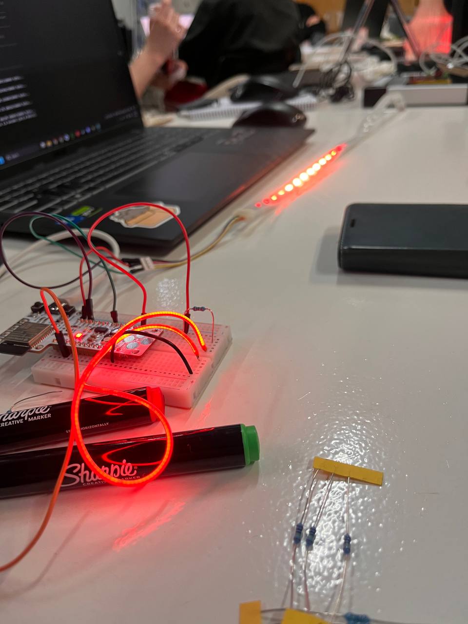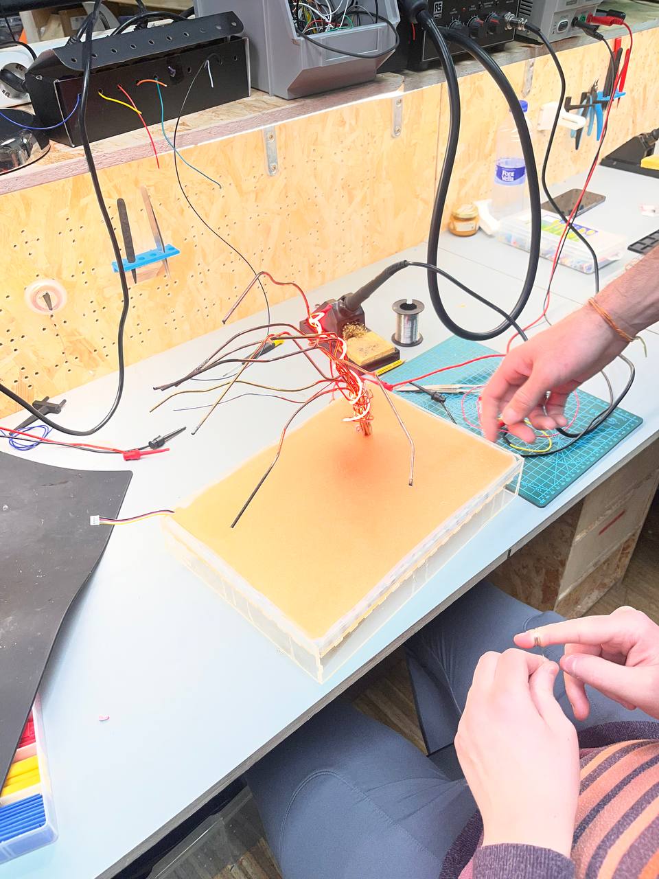 One of the main challenges during the development of the installation was identifying a material for the base that could both diffuse light and visually reveal the embedded electronics while maintaining structural stability. Initially, the intention was to cover the base with a transparent material so that the internal lighting system could remain visible. At first, resin was considered as a possible solution because of its transparency and structural rigidity. However, after testing this approach, the team realized that resin would not allow the same organic light diffusion that the project required.