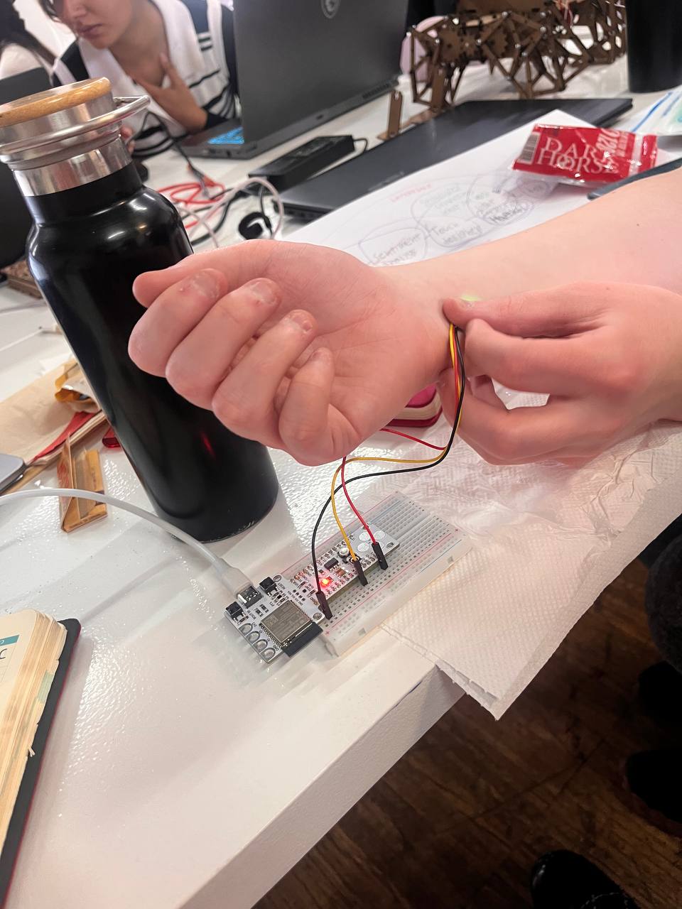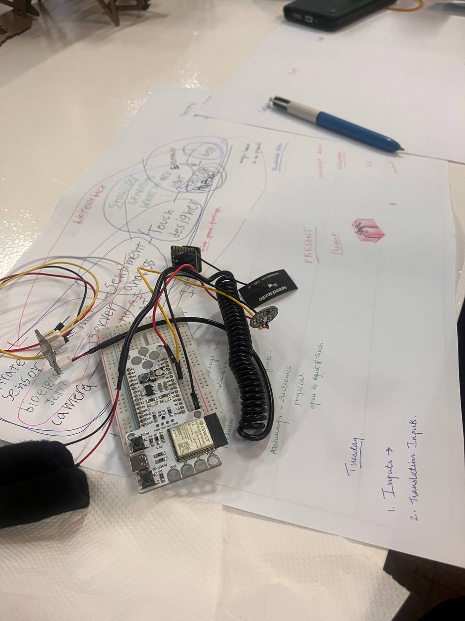 During the early stages of the project, we also explored different methods for sensing human emotions through physiological signals. Our initial idea was to create a system capable of detecting emotional responses and translating them into visual feedback. Inspired by devices such as polygraphs—which attempt to measure human reactions like stress through signals such as heart rate or skin conductivity—we experimented with several sensing approaches that could capture subtle bodily changes during interaction.