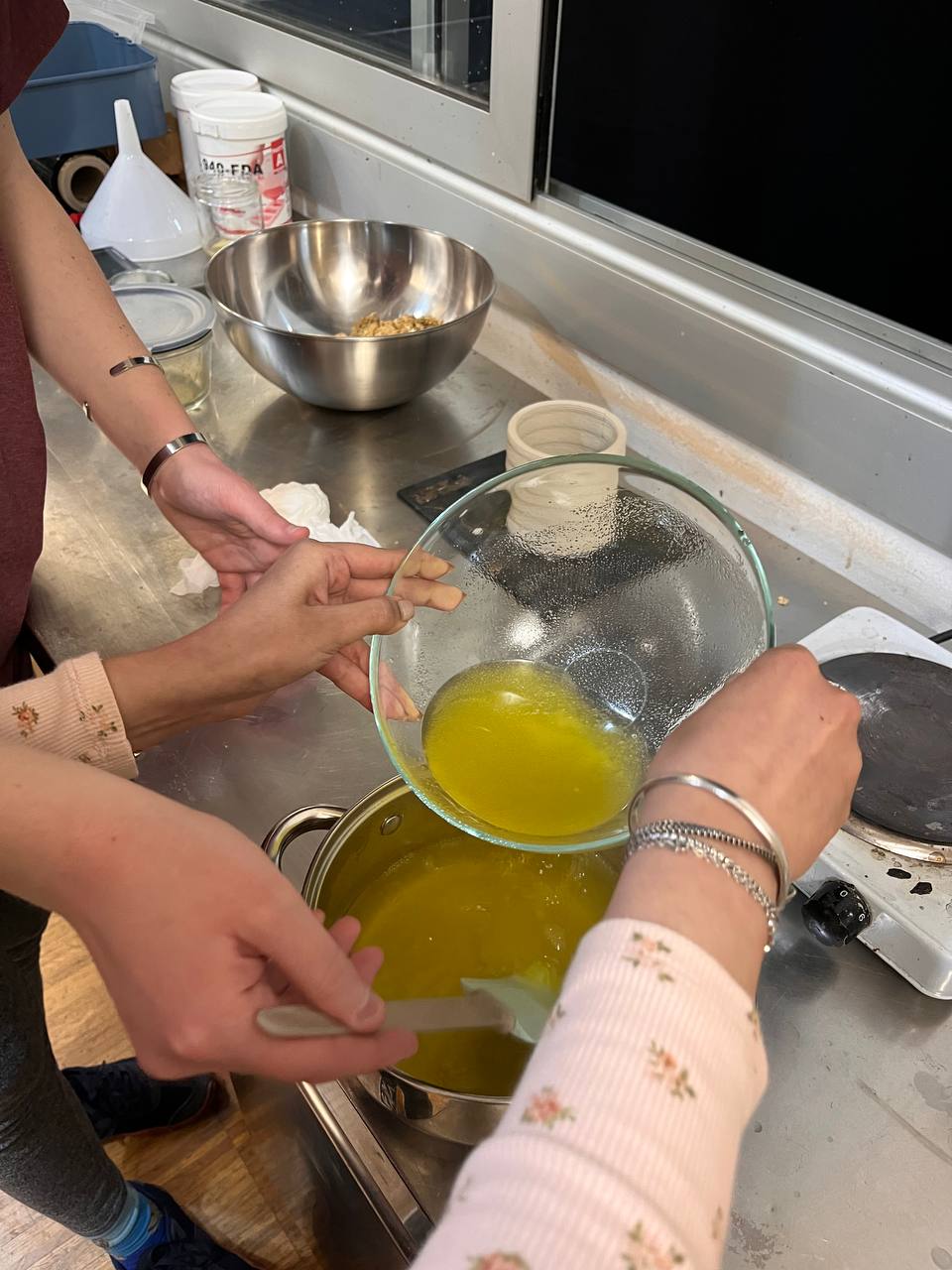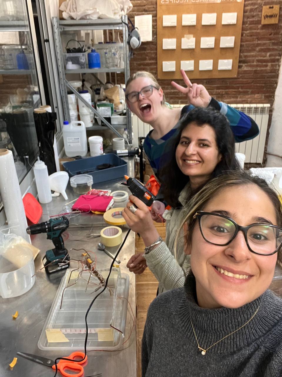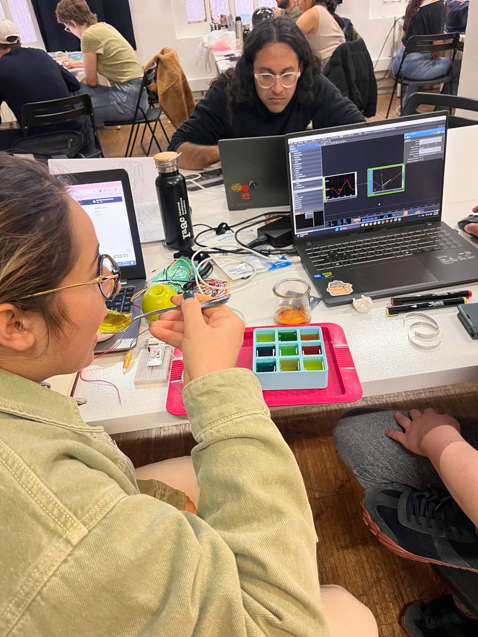 Following this setback, the team returned to experimentation and developed a more balanced mixture combining both agar-agar and gelatin. This final composition provided the necessary structural stability while still maintaining enough translucency for the LED light to diffuse through the material. Through this iterative process of trial, failure, and refinement, the team was able to produce a biomaterial base that functioned both aesthetically and structurally within the installation.