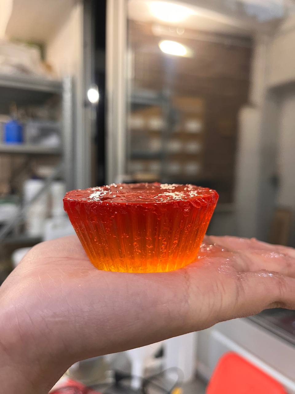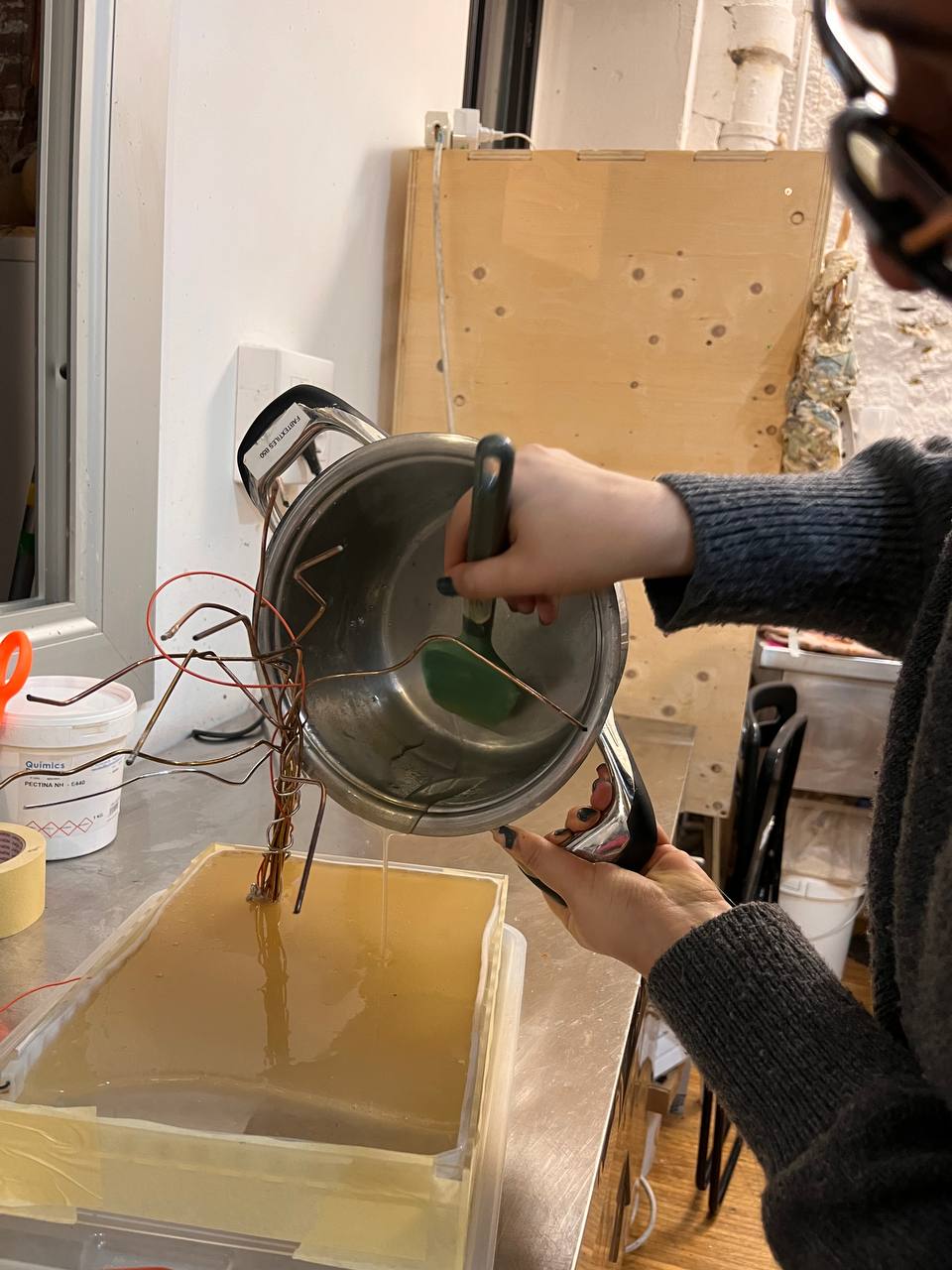 After evaluating this result, the team removed the existing material and decided to experiment with gelatin alone in order to achieve a more transparent result. While this version improved the clarity of the material, it introduced a new problem: the mixture lacked sufficient density and remained too liquid. The material required refrigeration to solidify, and even after cooling, it did not provide enough structural stability for the installation.