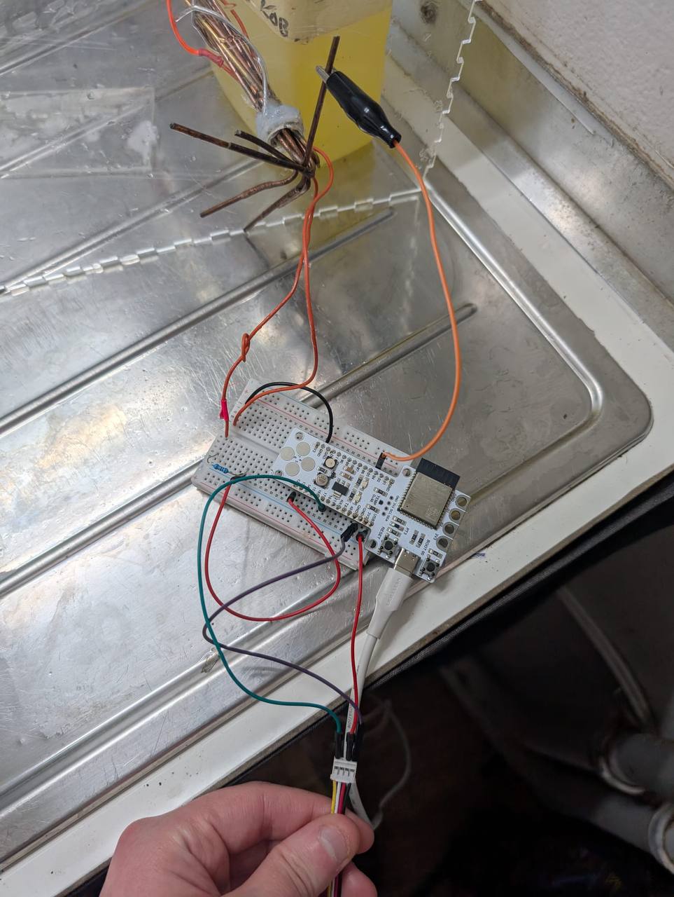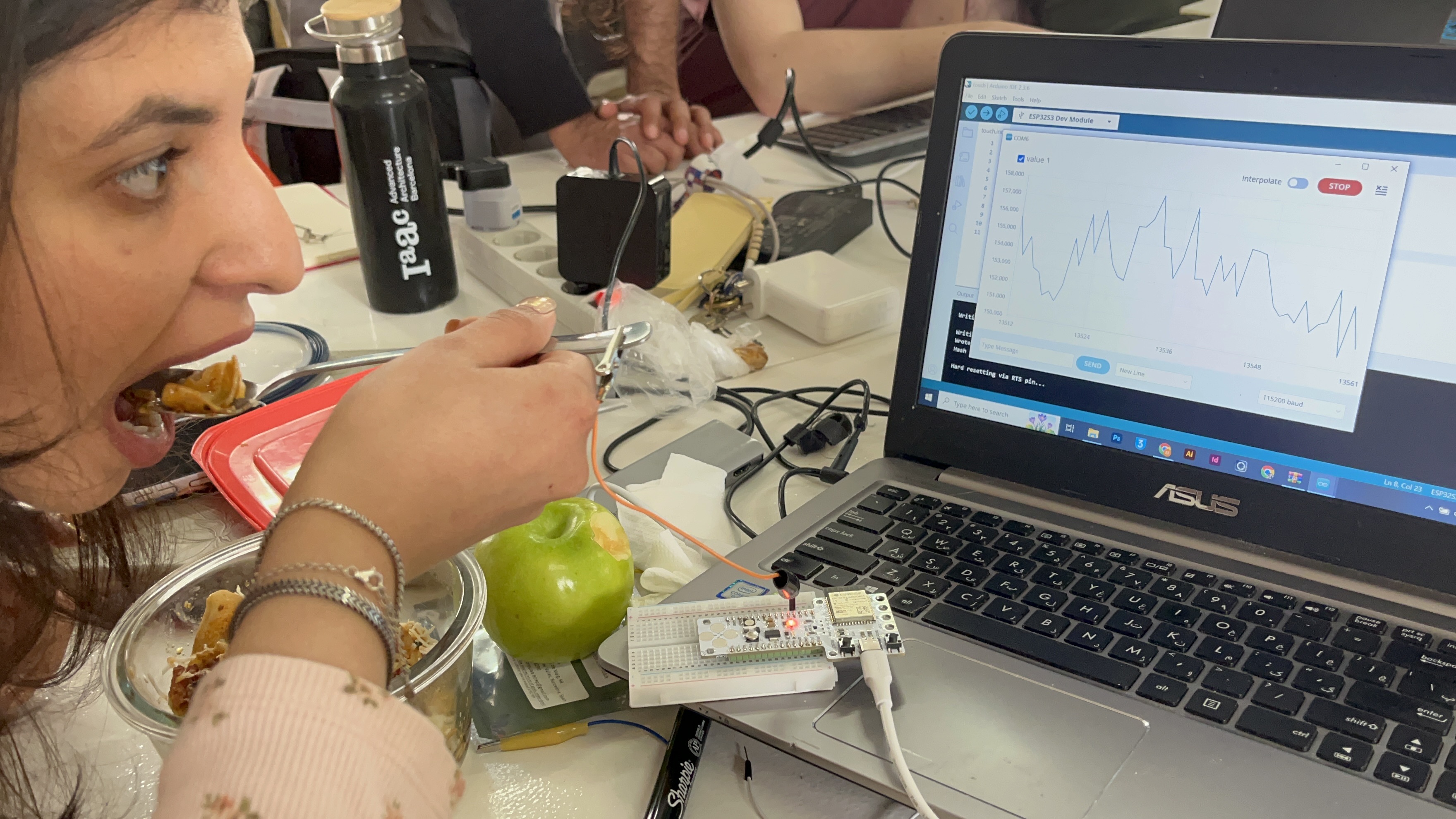 The next stage involved testing the electrical properties of various foods using capacitive sensing. Early experiments showed that foods with higher moisture content generated stronger electrical responses. Initially, water was considered because of its strong conductivity, but it proved difficult to integrate structurally into the installation.