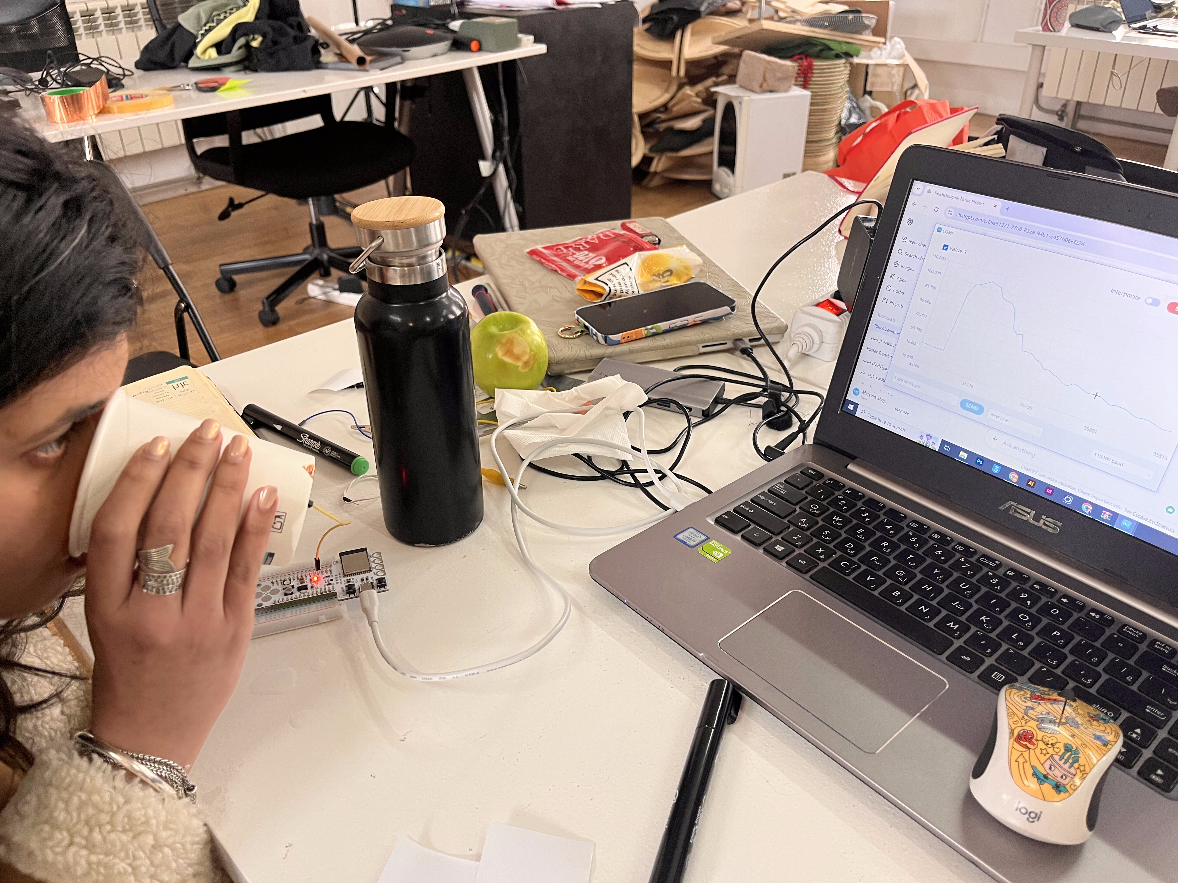 To understand how the sensor data behaved over time, an early system visualized the capacitance readings in TouchDesigner. Although this approach helped analyze the data, the team eventually shifted toward using light as the primary output. Light offered a more immediate and atmospheric way to translate electrical signals into a sensory experience.